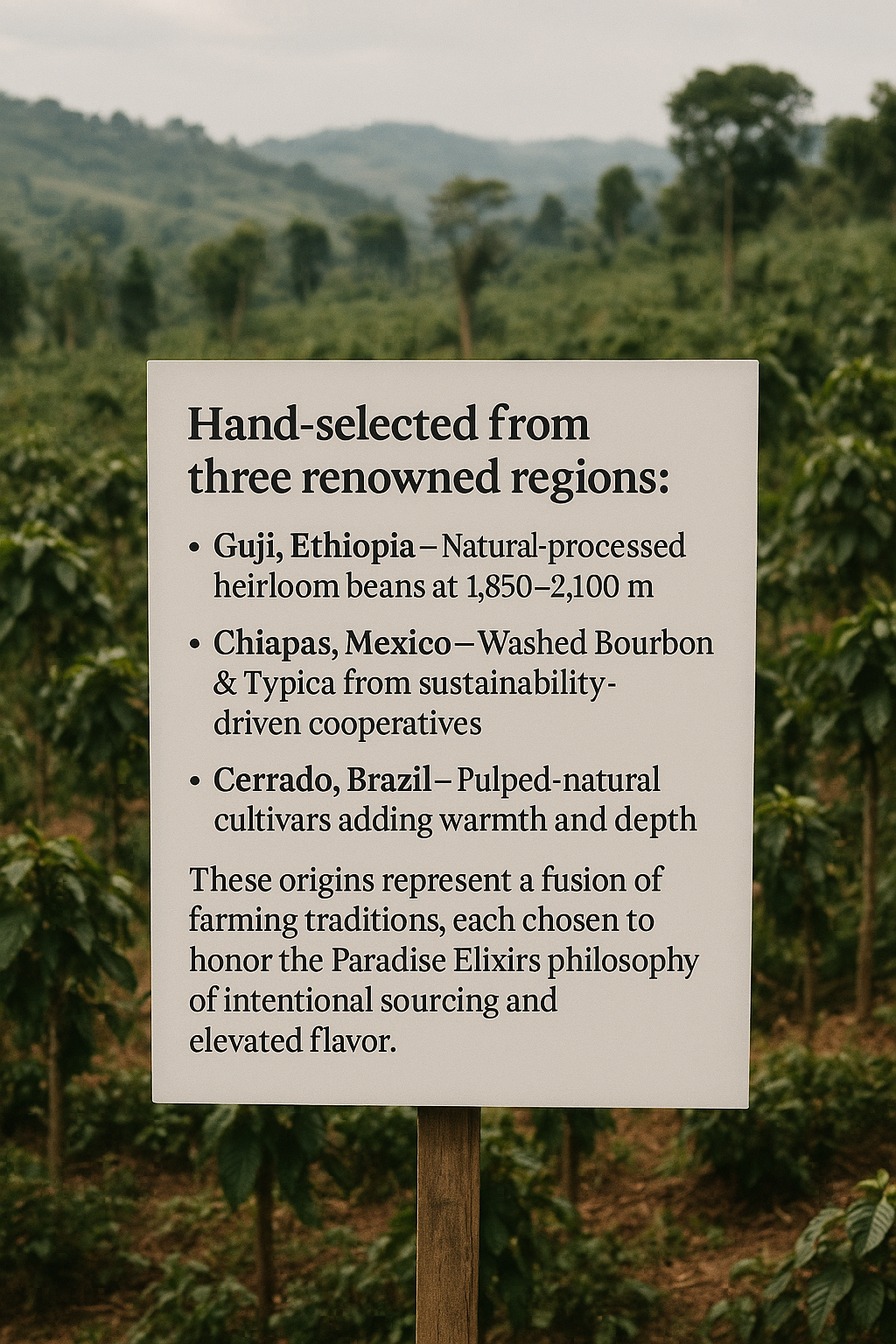 These origins represent a fusion of farming traditions, each chosen to honor the Paradise Elixirs philosophy of intentional sourcing and elevated flavor.